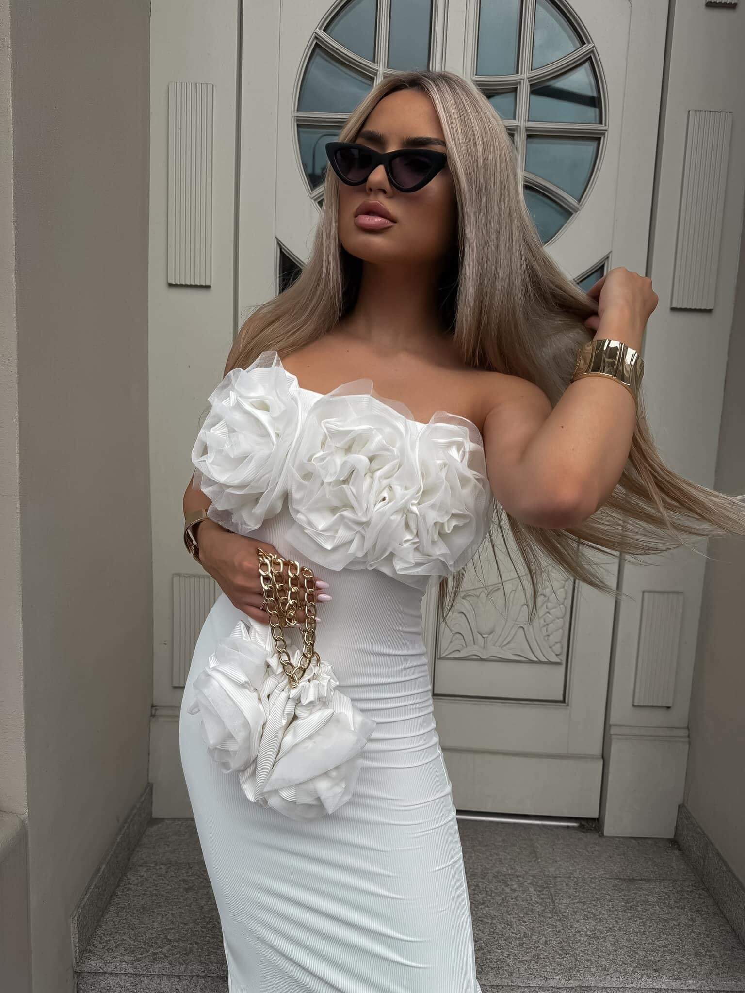 Zjawiskowa sukienka ROSE w komplecie z torebką. Wykonana z delikatnego prążkowanego materiału. Na przodzie ozdobne kwiaty, na tyle efektowne rozcięcie, na dole złote delikatne logo. W zestawie znajduje się torebka wizytowa wykonana z tego samego materiału.
