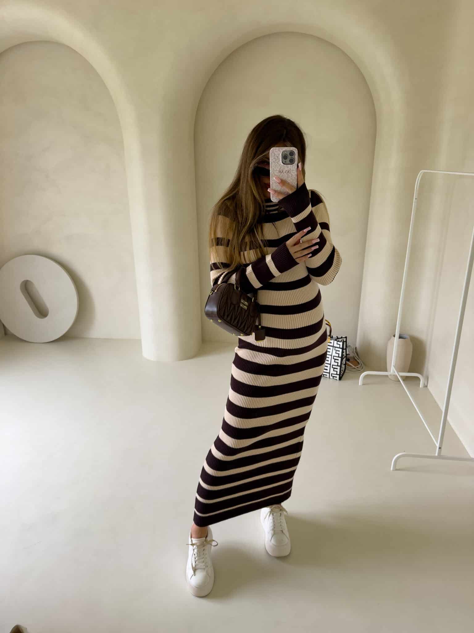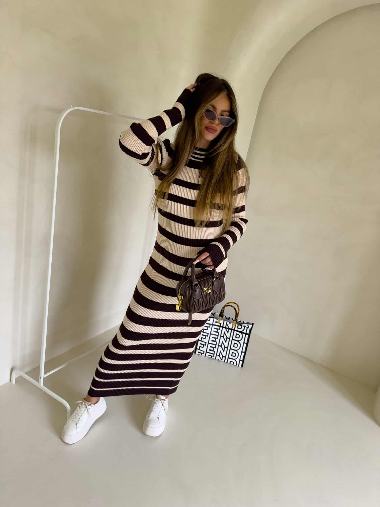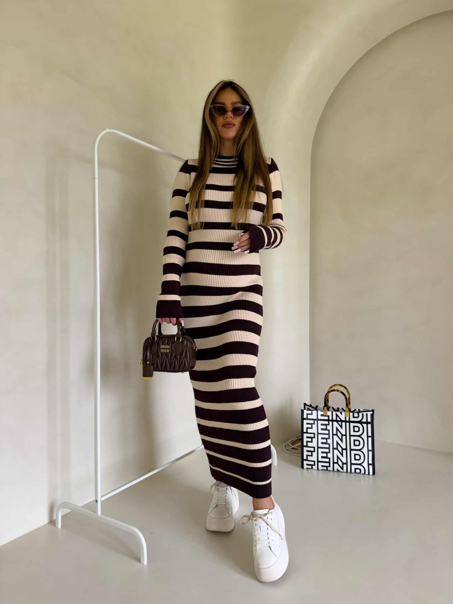 Dzianinowa sukienka VERSATILE BY ME, dopasowana w klasyczne poziome pasy. Na długi rękaw, sięga do kostek, co nadaje jej elegancki i minimalistyczny wygląd. Wzór pasków jest regularny, co optycznie podkreśla sylwetkę. Materiał prążkowany dzianinowy splot, który dobrze układa się na ciele.