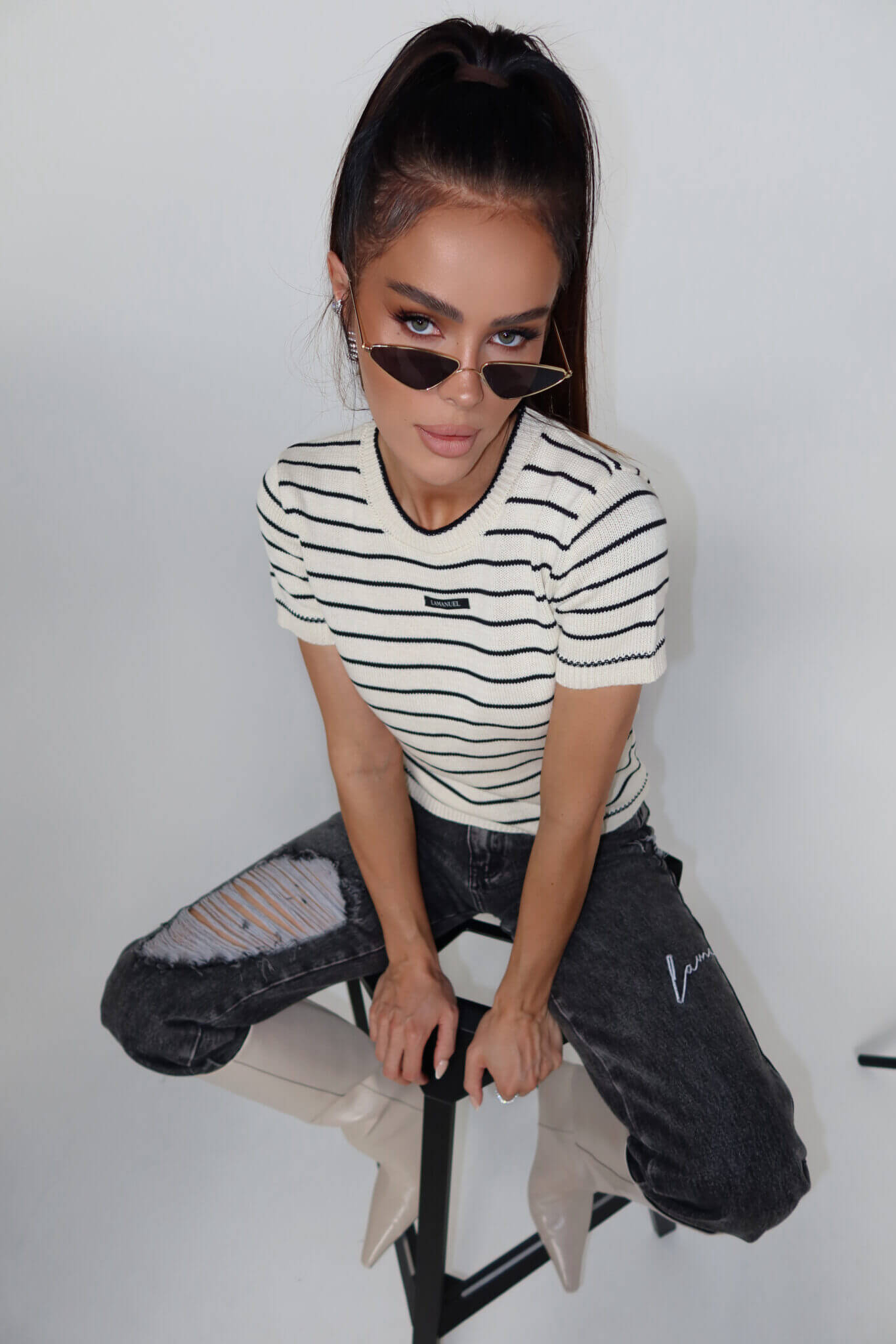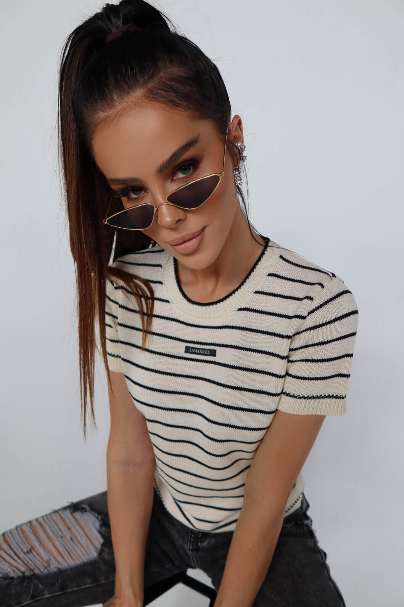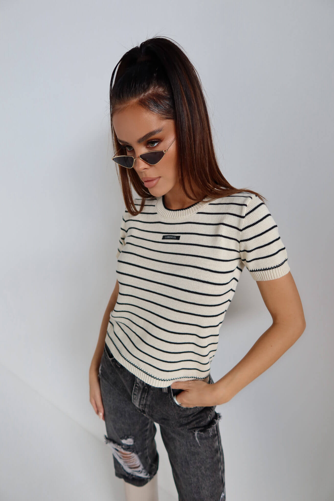 Krótko rękawowy sweter COFFE LAMANUEL z dzianiny o gęstym splocie i prostym, lekko dopasowanym fasonie. Model w ponadczasowy wzór w paski z okrągłym dekoltem i wykończeniem ściągaczowym przy szyi, rękawach i dole. Z przodu naszywka z logo, która subtelnie domyka look. Idealny do jeansów, spódnic i pod marynarkę – must have na cały rok.