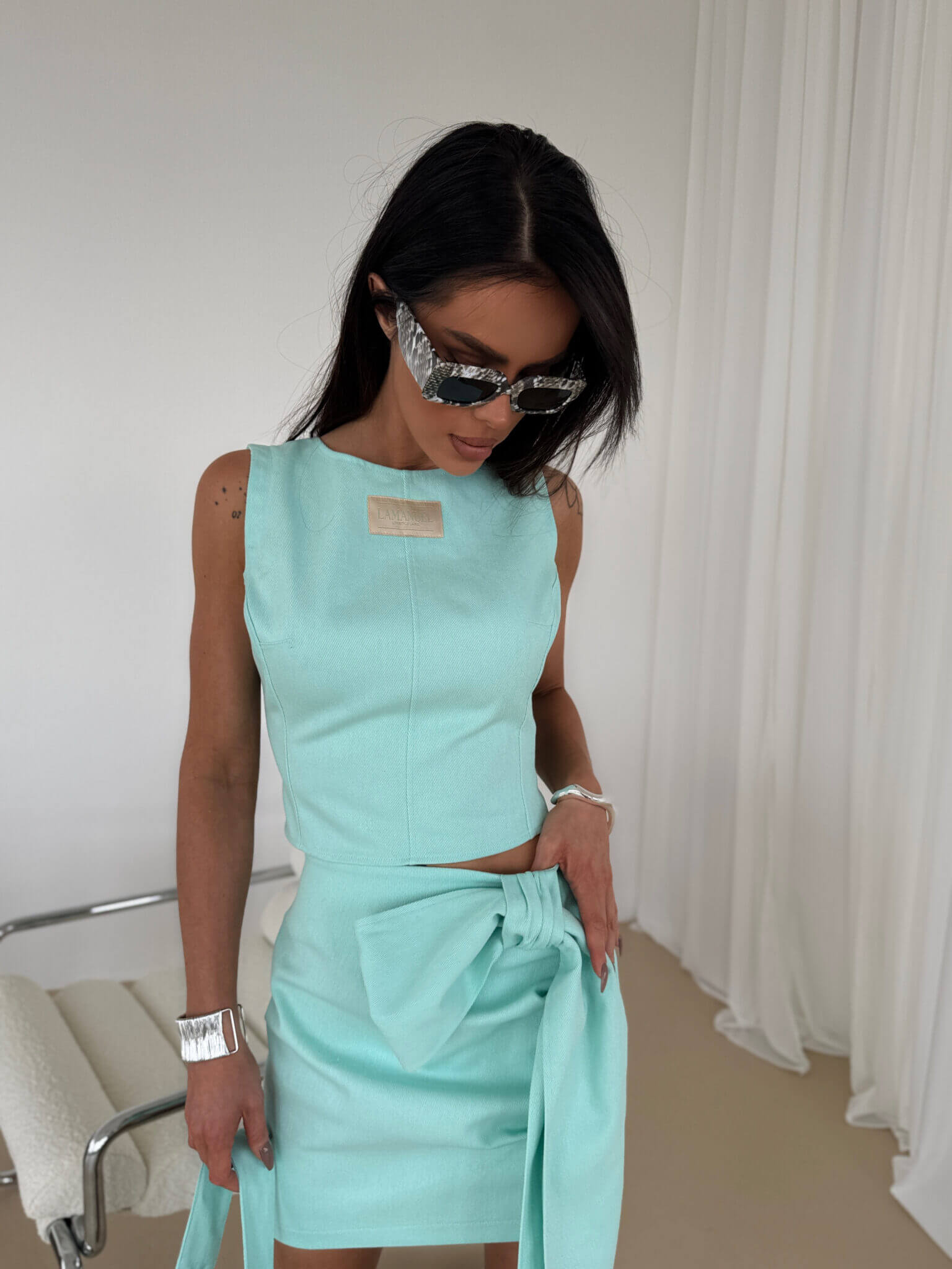 Top DENIM LA MANUEL wykonany z denimu o wyjątkowej strukturze, z charakterystycznym wiązaniem na plecach, które nadaje mu oryginalny wygląd. Regulacja na plecach pozwala na idealne dopasowanie do sylwetki, a elastyczna wstawka zapewnia komfort noszenia. Klasyczny krój podkreśla talię i pięknie eksponuje plecy. Na przodzie naszyta subtelna metka z logo. Idealnie komponuje się z denimową spódnicą, tworząc efektowny komplet oraz torbą do kompletu.