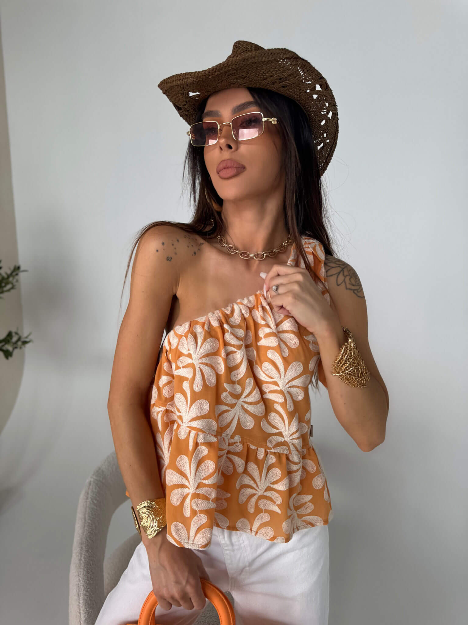 Top FLORAL LAMANUEL o kobiecym, letnim fasonie na jedno ramię, z efektownym wiązaniem na ramieniu. Uszyty z lekkiego, przewiewnego materiału ozdobionego wyrazistym, haftowanym wzorem roślinnym. Luźny krój zapewnia swobodę ruchów, a delikatne marszczenie przy dekolcie i dole dodaje całości lekkości i objętości. Idealny na wakacyjne dni i letnie stylizacje.