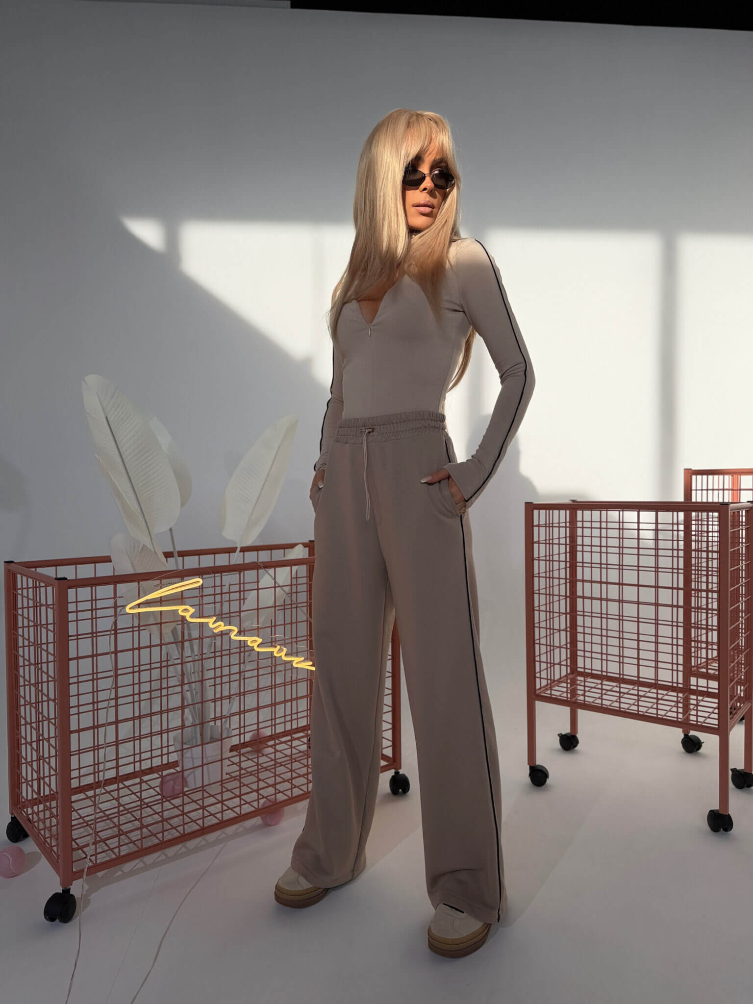 Dopasowany, elastyczny top uszyty z podwójnej warstwy wiskozy. Materiał jest miękki, przyjemny w kontakcie ze skórą, lekko chłodny w dotyku. Ukryty zamek pozwala dopasować dekolt do sytuacji – nisko lub wysoko, bez widocznych elementów. Wzdłuż rękawów wszyta taśma z logo – prosty detal, który nadaje kierunek całej stylizacji. Sprawdza się solo, ale gra też jako baza pod warstwy.