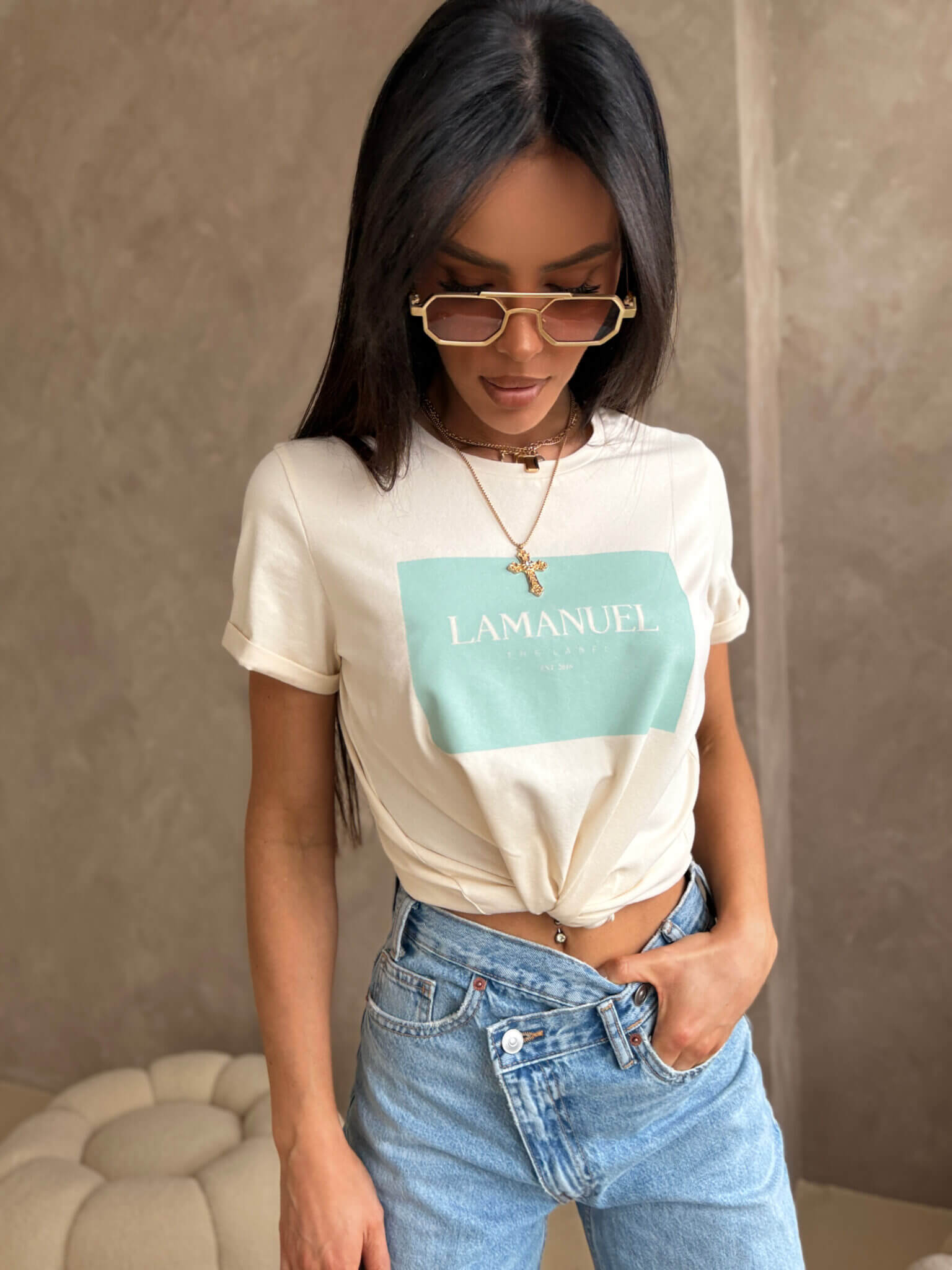 T-shirt FRESH LA MANUEL o klasycznym kroju z krótkim rękawem i okrągłym dekoltem, wykonany z miękkiej i oddychającej tkaniny. Luźny fason zapewnia komfort noszenia i swobodę ruchów. Na przodzie znajduje się kontrastowy nadruk z logotypem, który nadaje koszulce nowoczesny charakter. Podwinięte rękawy dodają jej casualowego stylu, a uniwersalny design sprawia, że świetnie komponuje się zarówno z jeansami, jak i bardziej eleganckimi elementami garderoby. Idealny na co dzień, do sportowych i miejskich stylizacji. Może być noszony zarówno luźno, jak i wpuszczony w spodnie czy spódnicę dla bardziej dopasowanego efektu.